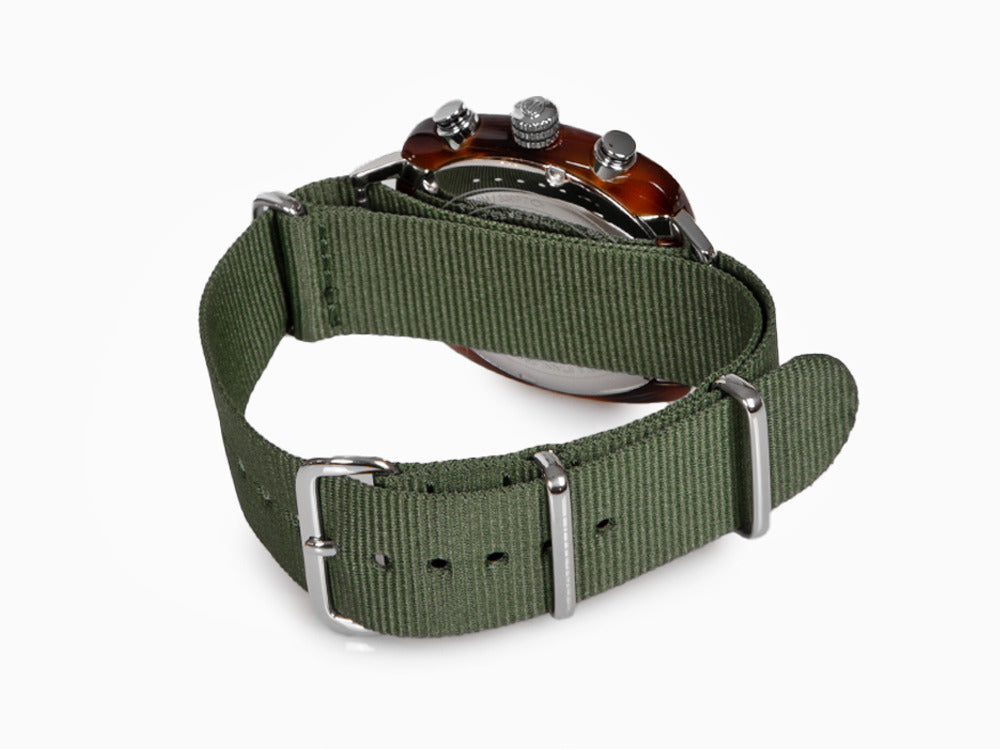• La montre Briston Clubmaster Sport Acetate offre un look plus sportif avec un boîtier de 42 mm et une échelle tachymétrique pour le modèle chronographe, sans oublier son bracelet NATO interchangeable. Avec un cadran blanc et 2 compteurs noirs, cette montre s'inspire des lignes des voitures de course des années 1960.