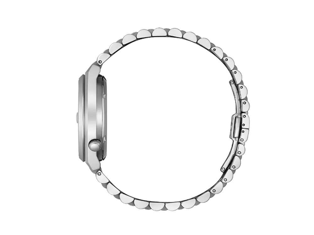 • La Citizen Tsuyosa 60 NK0020-55E redéfinit l'élégance moderne avec son boîtier en acier inoxydable de 40 mm, poli et satiné, qui allie robustesse et sophistication. Le cadran noir présente un motif guilloché qui apporte profondeur et dynamisme visuel, tandis que les index appliqués et les aiguilles luminescentes assurent une excellente lisibilité. Le bracelet de type Jubilee intégré, avec ses maillons brossés et polis, offre confort et élégance à chaque utilisation. Faites de chaque jour une expérience de style et de précision.