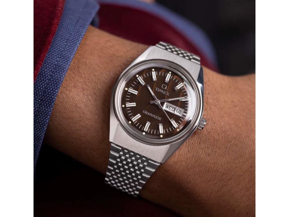 • La Q Timex Falcon Eye est une réinterprétation contemporaine d'un design emblématique des années 1970, alliant l'élégance classique à des détails modernes pour offrir une montre intemporelle et sophistiquée. Le boîtier en acier inoxydable de 38 mm abrite un cadran brun orné d'un motif Côtes de Genève distinctif, qui ajoute de la profondeur et du caractère au design. Les aiguilles luminescentes et les index dimensionnels permettent une lecture claire dans diverses conditions de luminosité.