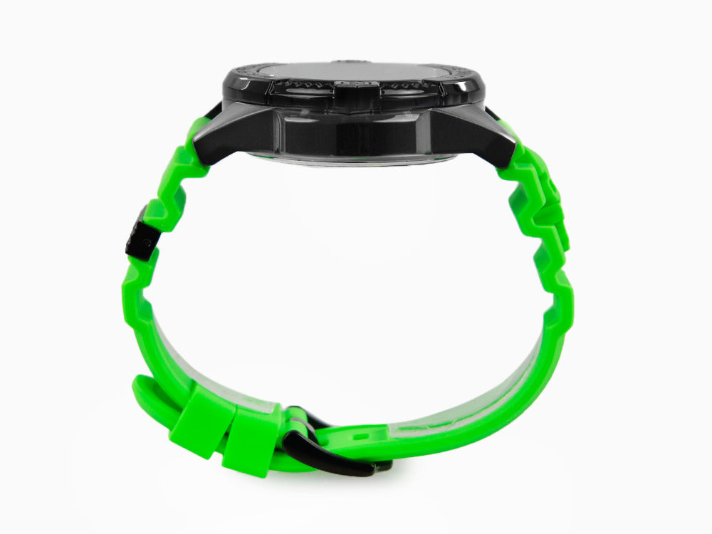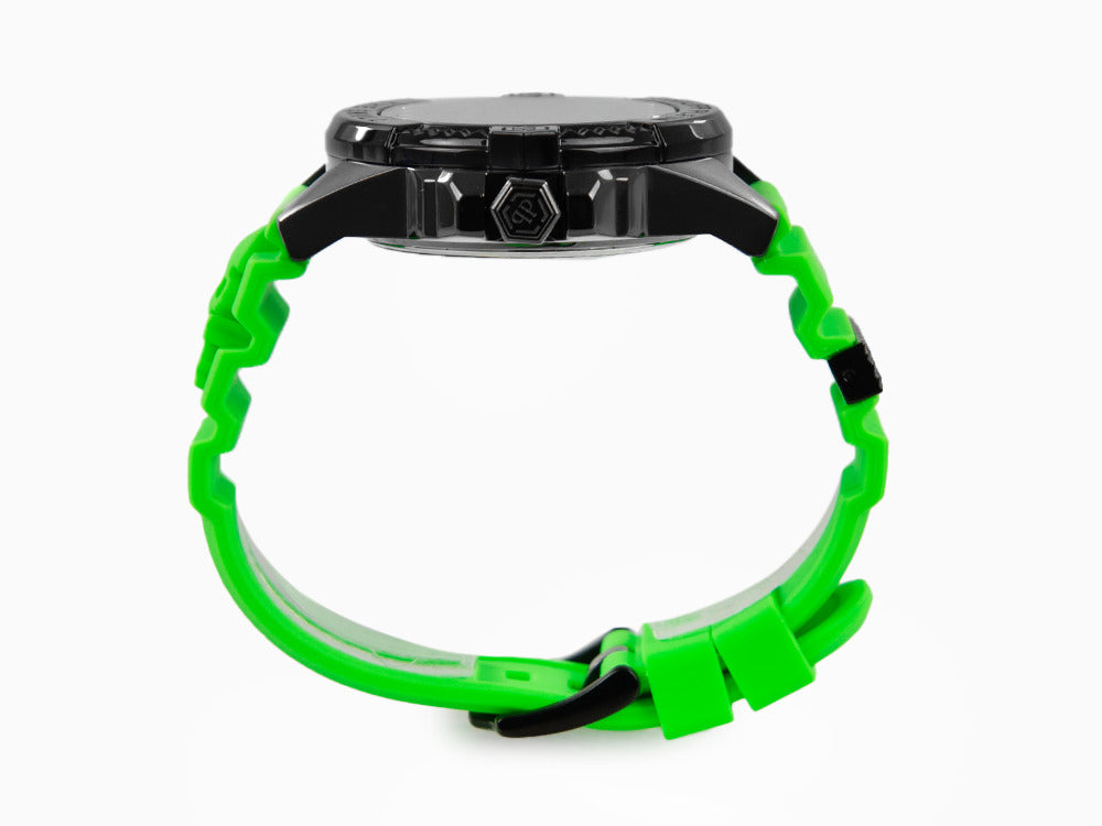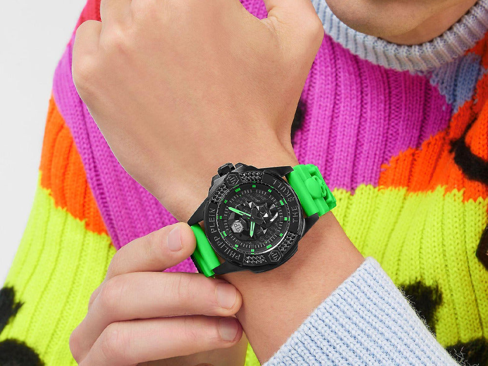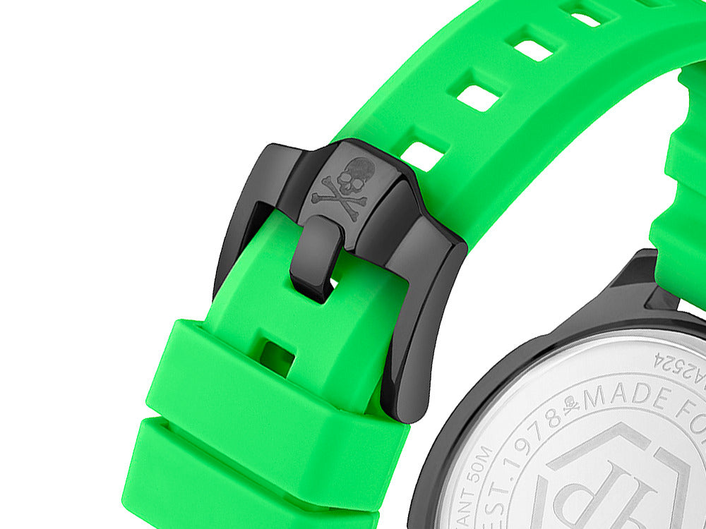 • Cette saison, Philipp Plein présente sa collection The Skull. Chaque montre prouve qu'aucun défi n'est trop grand et aucun objectif n'est inaccessible. La combinaison d'un cadran noir avec des détails verts et un bracelet en silicone vert avec des détails noirs ajoute la touche finale. Le nom de la marque et de la collection sont gravés sur le boîtier.