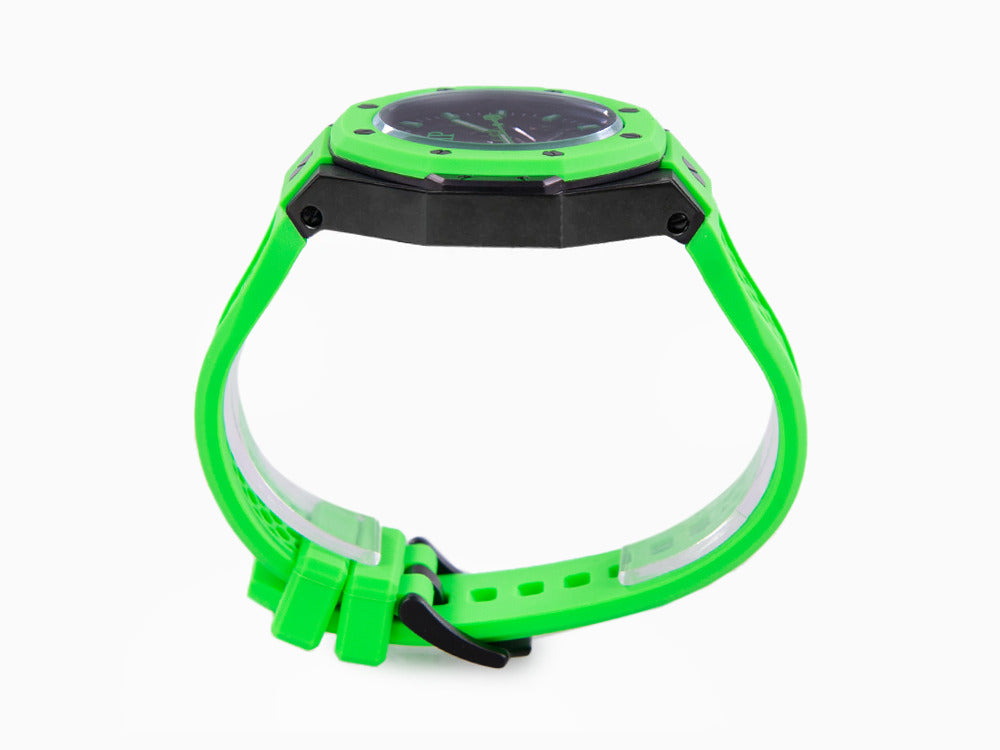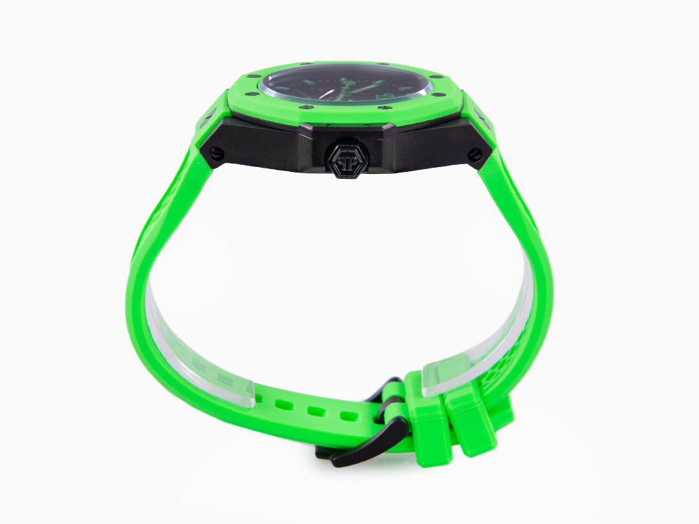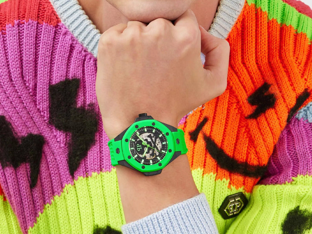 • La collection Skeleton Royal de Philipp Plein se distingue par son cadran de 46 mm sur lequel apparaît le crâne avec le logo gravé. La lunette vissée met en valeur le design attrayant de la montre. Cette montre automatique associe un cadran en acier avec des détails verts et un bracelet en silicone vert.