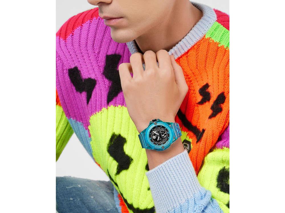 • Philipp Plein présente de nouvelles couleurs dans sa collection $kull Scuba Duba. La montre conserve son ADN unique et son design moderne, avec un crâne gris sur le cadran et un boîtier en acier recouvert de PVD bleu avec un bracelet en polycarbonate assorti. Elle a un diamètre de 44 mm, des détails noirs et une résistance à l'eau de 5ATM.